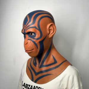 The product material is soft and realistic, with spots on the skin, veins and bloodshot eyes clearly visible. A hyper-realistic effect.